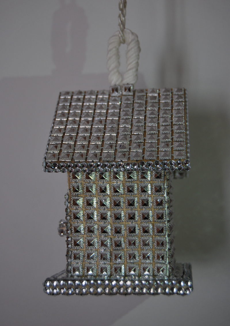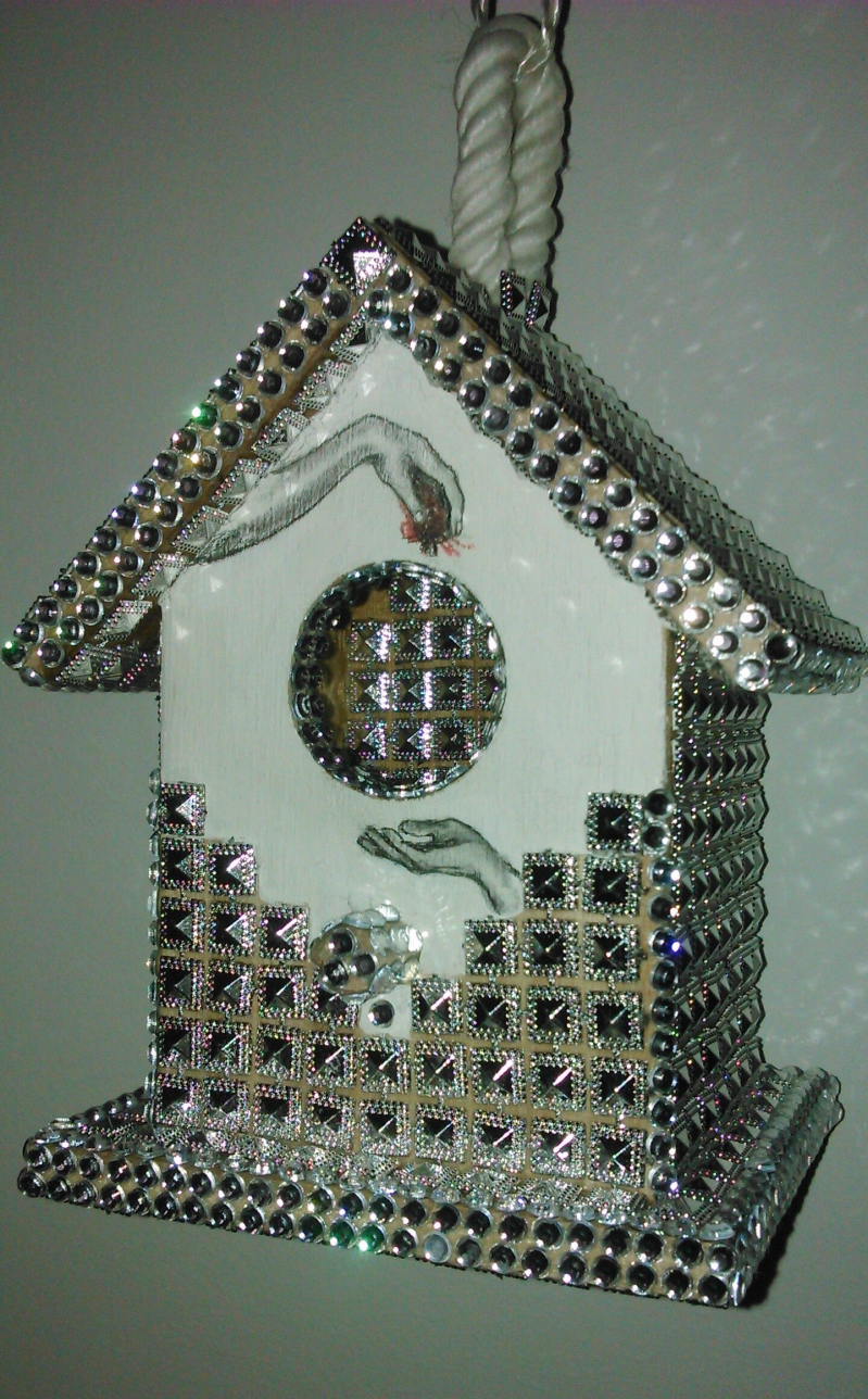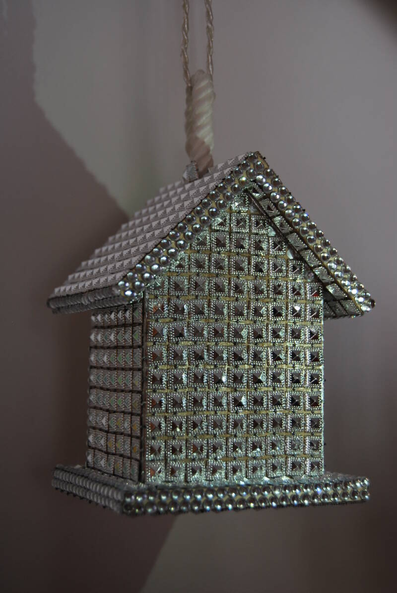 Casita de madera, lápiz, acrílico y rocalla. / Wooden house, pencil, acrylic, and beads.