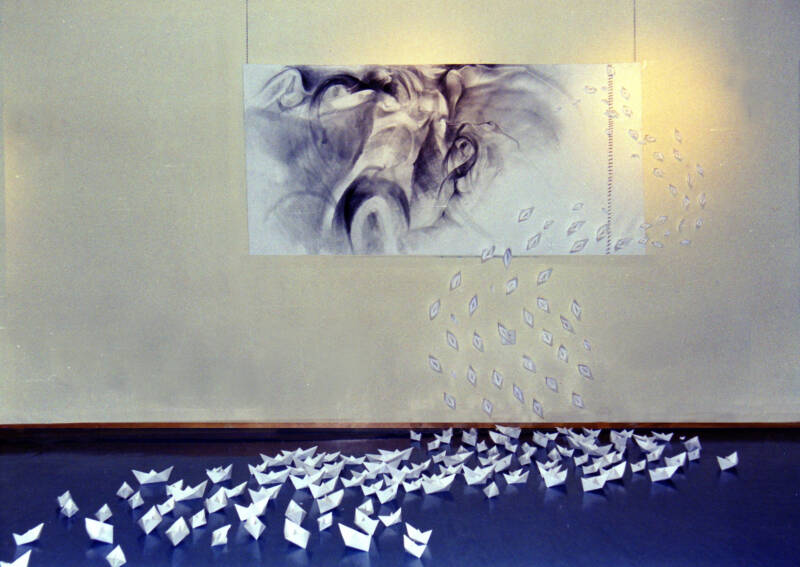 Pencil on canvas, black thread, and paper boats. / Lápiz sobre lienzo, hilo negro y barquitos de papel.